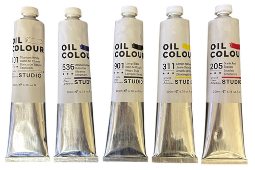 Set of 5 Artist Quality Oil Paints White, Yellow, Red, Blue, Black 200 ml Tube ASTM D4236