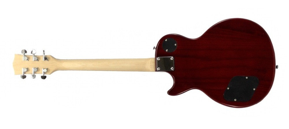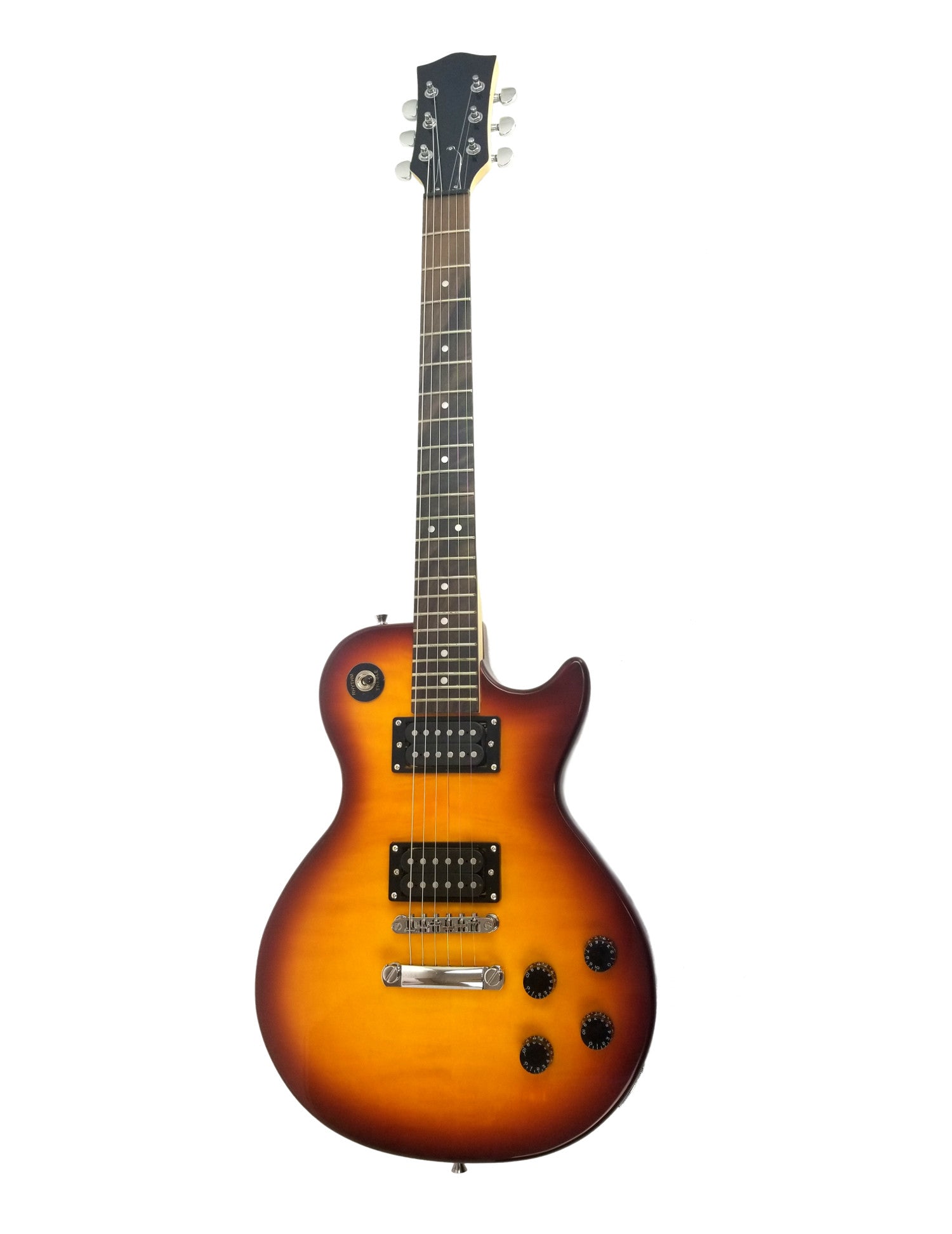 Lightweight 39 inch classic LP style electric guitar features C-shaped sturdy maple neck, engineer wood fretboard with fret position marks, 22 silver nickel frets, hollowed wood body with beautiful sunburst tobacco finish and chrome bridge .
