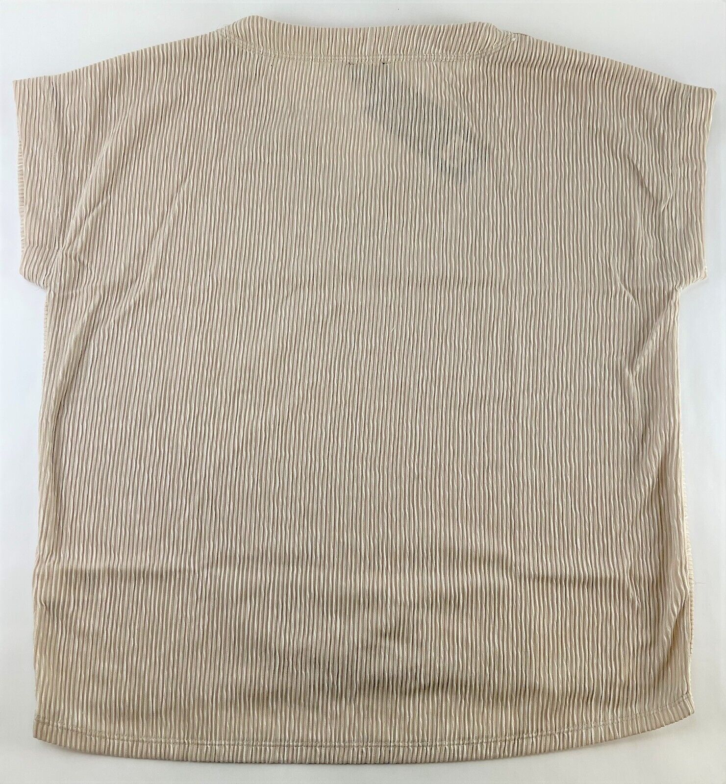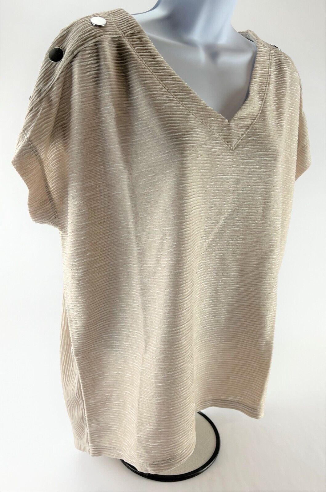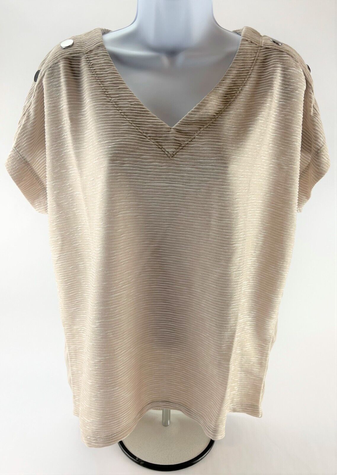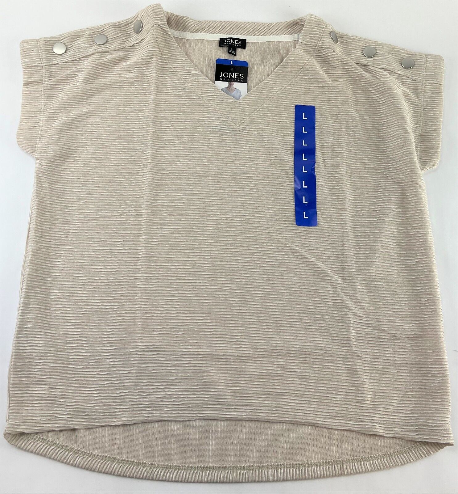 Jones New York Textured V Neck Top Khaki/Ivory Blouse with Button Sleeve Accents