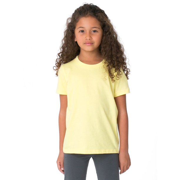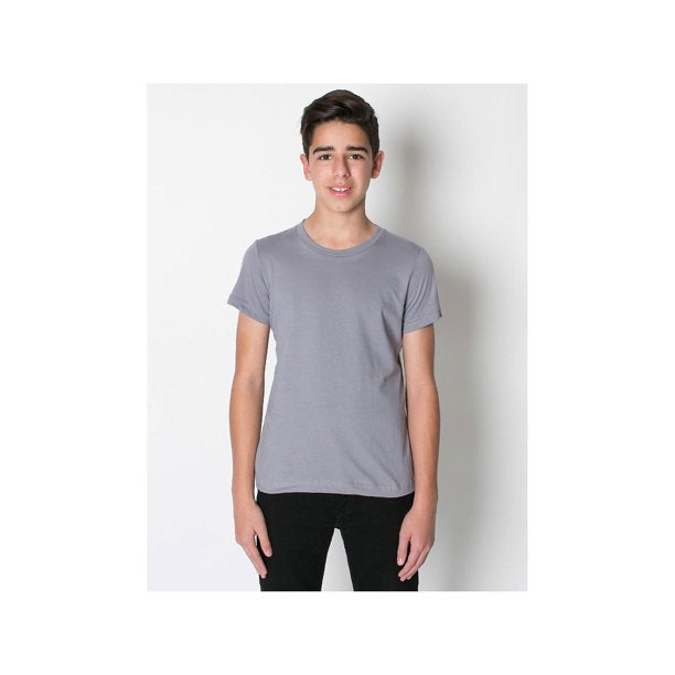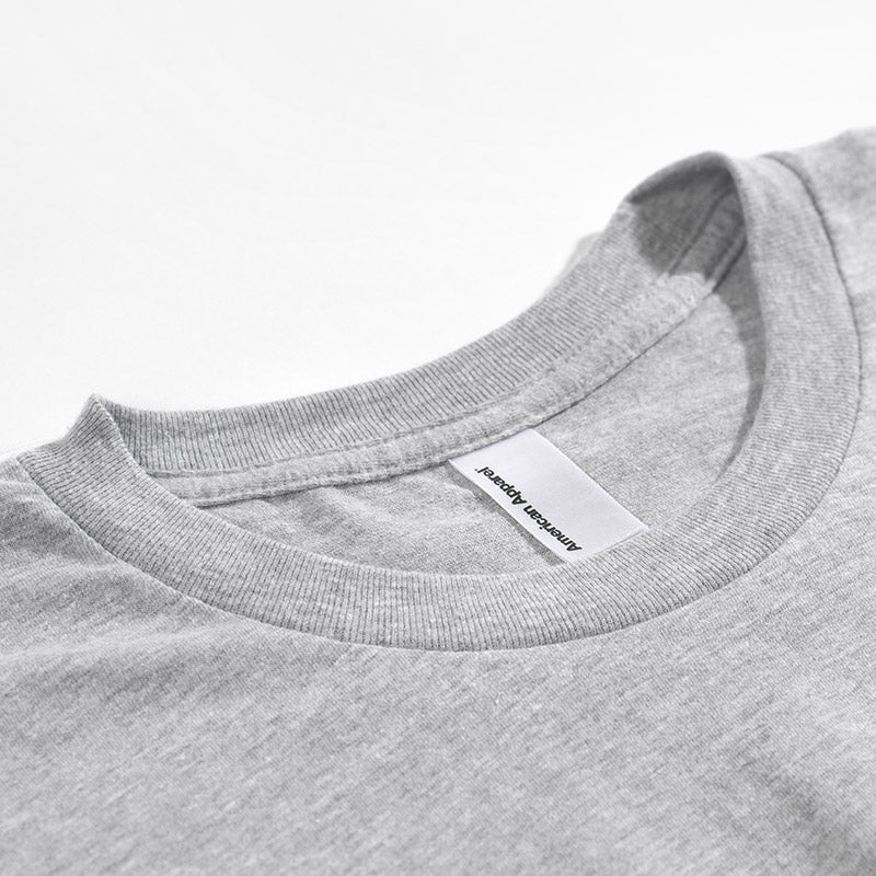American Apparel Kids' Fine Jersey T-Shirts are made of 100% combed ring-spun cotton with 100% cotton thread for most colors. Heather Grey is made of 90% ring-spun cotton 10% polyester. Shoulder-to-shoulder tape and 3/4" seamed collar for increased comfort and durability.